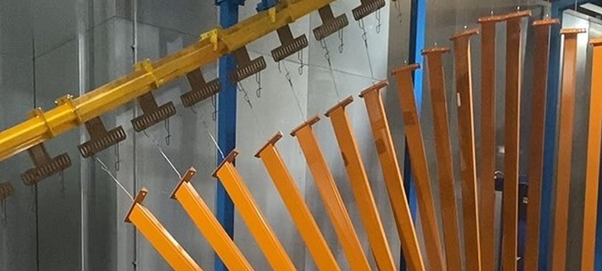 Amber Industries diseñó y fabricó un dispositivo para descargar automáticamente vigas de estanterías desde un transportador de cadena aéreo después de que hubieran pasado por la planta de pintura y colocarlas planas sobre una cinta transportadora para su posterior viaje a un área de despacho.