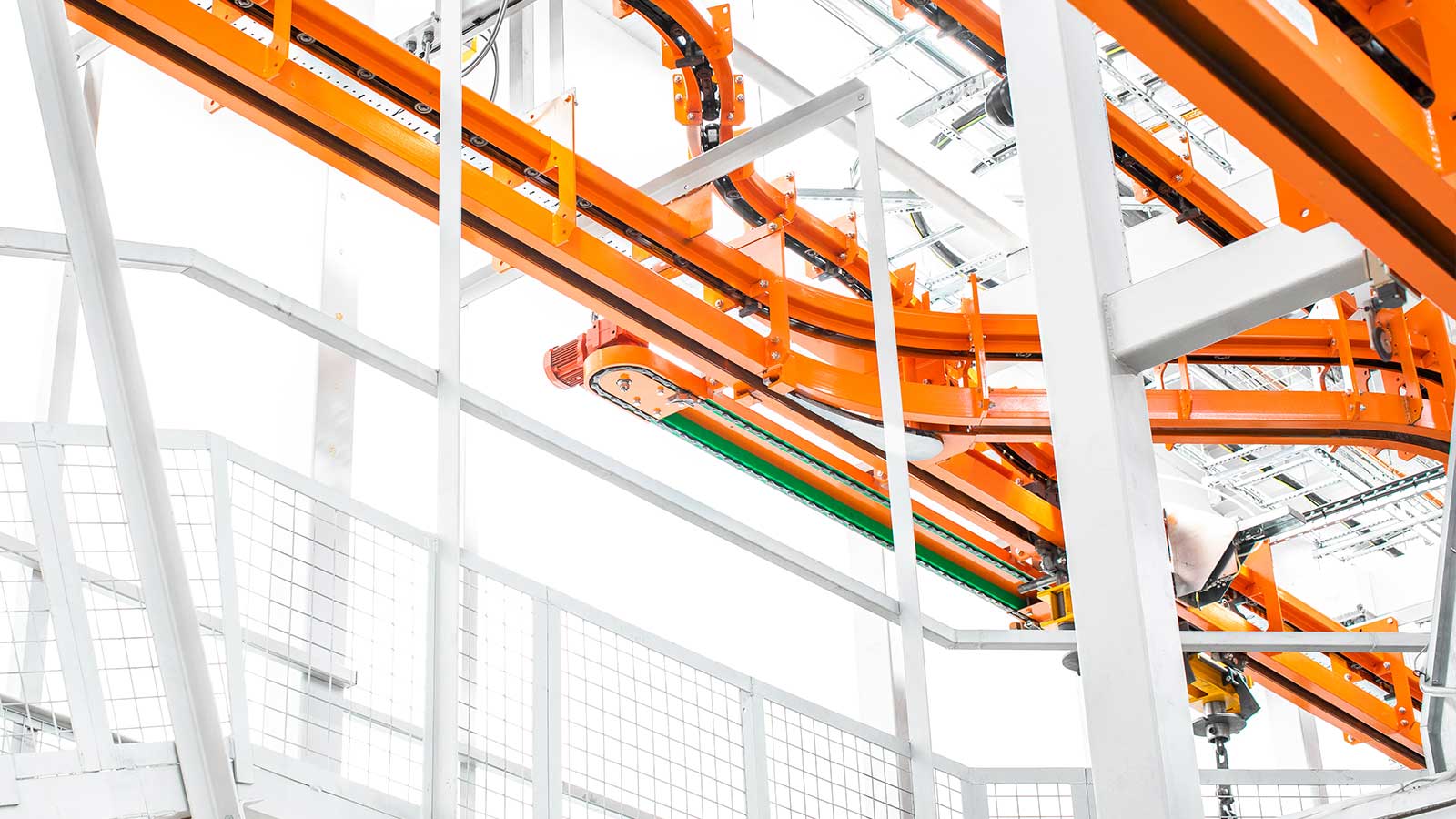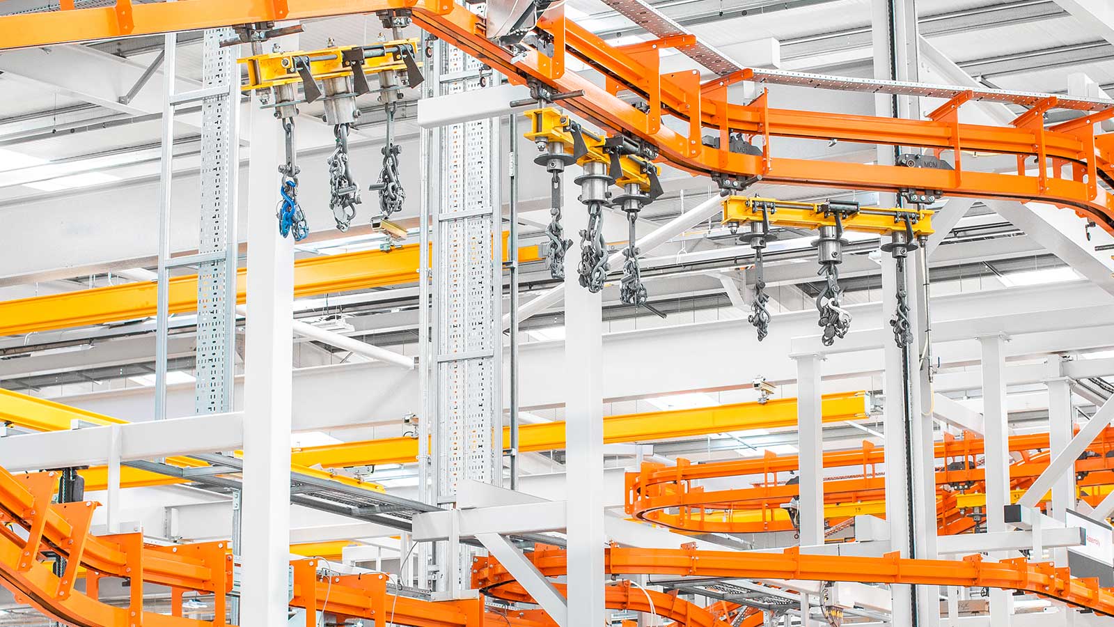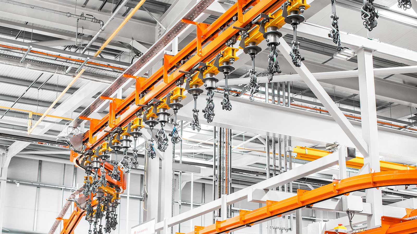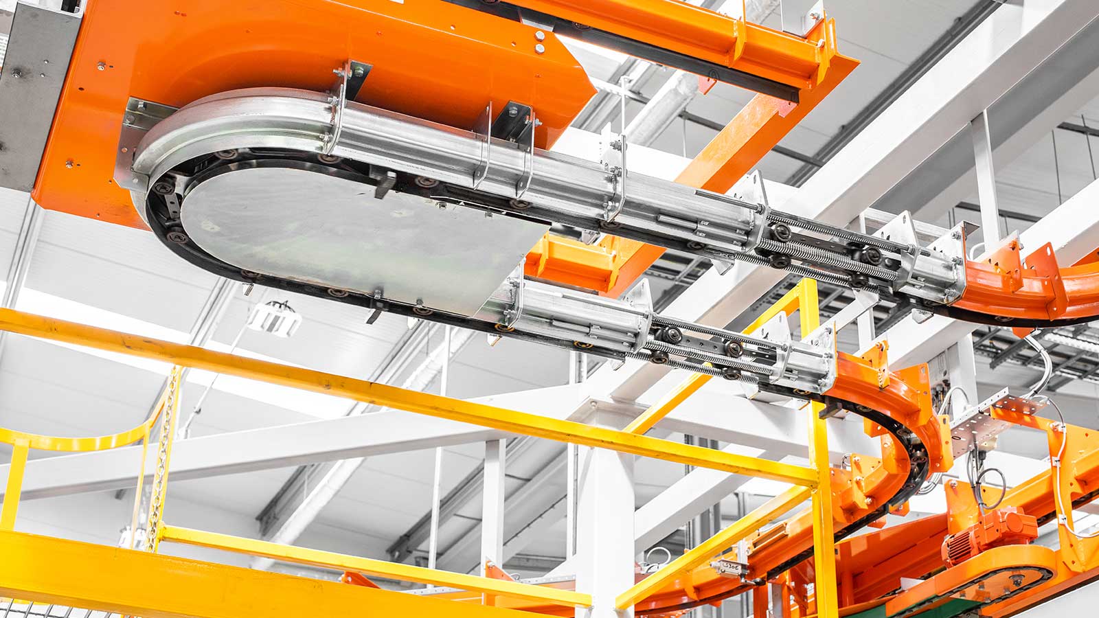 Una gama de transportadores aéreos de cadena "motorizados y libres" diseñados con la flexibilidad necesaria para dirigir el producto por diferentes rutas dentro del mismo sistema, según la secuencia de procesos. Las dos vías coextensivas (cadena y carro) del sistema transportador MCM Autotrack permiten la creación de zonas de almacenamiento intermedio y acumulación, la selección automática de rutas y los cambios de velocidad. Esto significa que cualquier tipo de producto puede identificarse (electrónicamente o con indicadores mecánicos) y enviarse automáticamente a destinos específicos, como líneas de planta de proceso, líneas de ensamblaje, estaciones de inspección y zonas de descarga, en cualquier secuencia deseada.