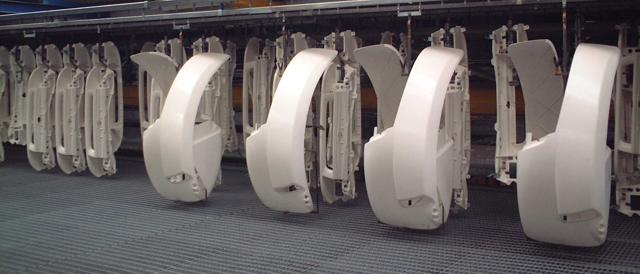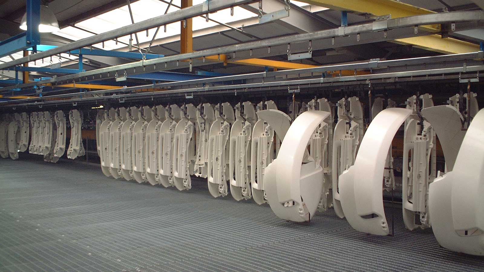 Esta gama de sistemas transportadores incluye los modelos PT30, PT60, PT100 y PT100S. Estos sistemas constan de una cadena biplanar accionada por una unidad de accionamiento que se desplaza sobre un riel de acero cerrado, que puede tener sección transversal rectangular o cruciforme cuando se requiere una mayor capacidad de carga. Los colgantes, fijados a la cadena a pasos regulares, sobresalen de una ranura en la parte inferior del riel y permiten suspender el producto.