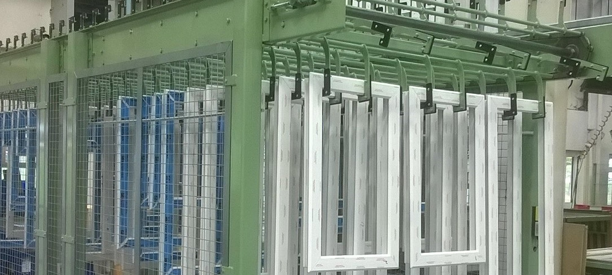 Arriba se muestra una unidad de almacenamiento y enfriamiento al final de la línea de producción para marcos de ventanas de UPVC.