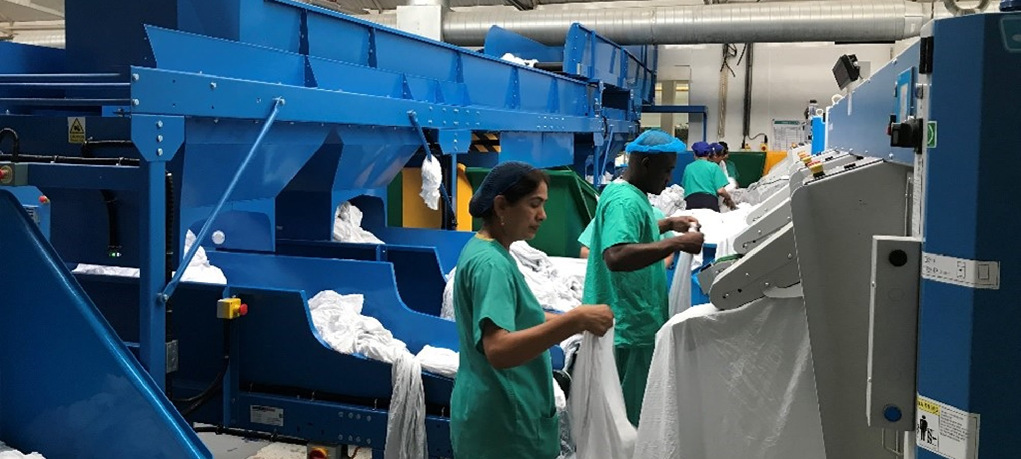La ropa sucia que entra en el almacén se transporta mediante cintas transportadoras para su traslado rápido desde los camiones de reparto hasta las zonas de clasificación o lavado. La clasificación también puede realizarse en las cintas transportadoras de entrada, según la distribución de la lavandería. Tras el lavado, la ropa limpia se prensa para eliminar el exceso de agua y se vuelven a utilizar las cintas transportadoras para transferirla a una zona de clasificación o directamente a las secadoras. Tras el secado, se utilizan más cintas transportadoras para transferir la ropa antes de que llegue a los equipos de operarios que alimentarán las planchadoras y plegadoras.