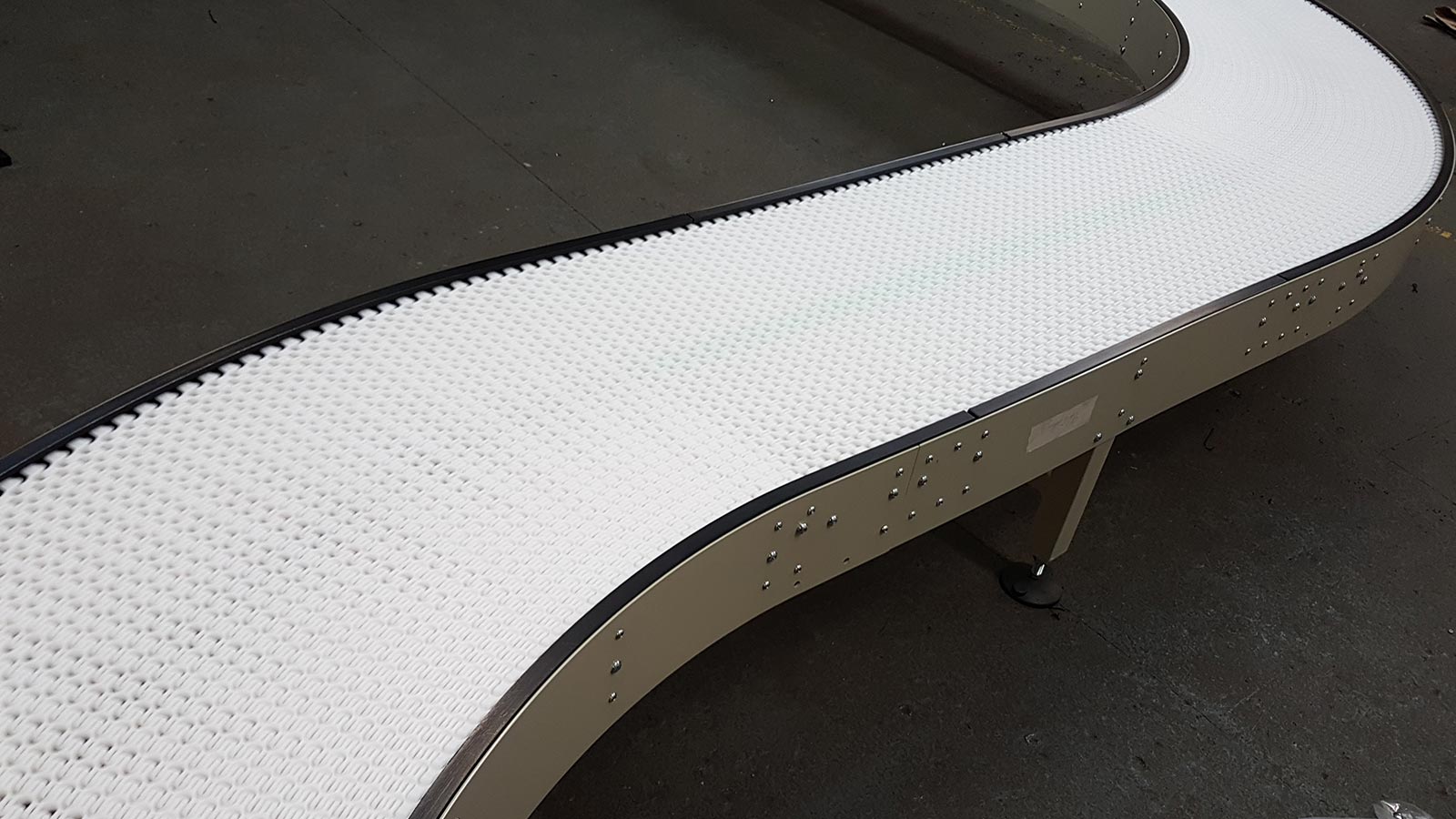 La construcción de la banda con cadena de listones y eslabones de placas permite que la banda se flexione si las placas están unidas por una bisagra en el centro de su tramo. Esto proporciona a estos transportadores la ventaja de poder girar gradualmente en las esquinas.