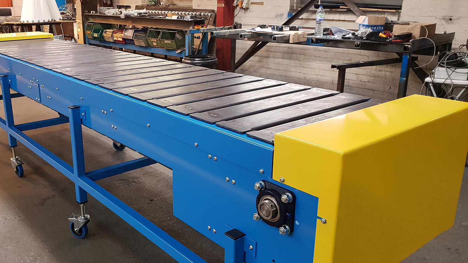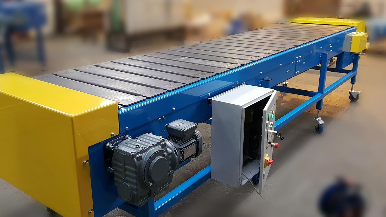 Cada listón está unido a un par de cadenas de transmisión con cojinetes de rodillos paralelos, una en cada extremo del listón, accionadas por ruedas dentadas acopladas mediante un eje principal a un motorreductor. Los listones pueden fabricarse con diferentes secciones de acero si es necesario, por ejemplo, placas planas, tubos, ángulos, etc., y en ocasiones se pueden utilizar materiales alternativos como madera dura o polímero moldeado. La selección del ancho del transportador y del tipo de listón depende del tamaño, el peso y la naturaleza del producto transportado.
